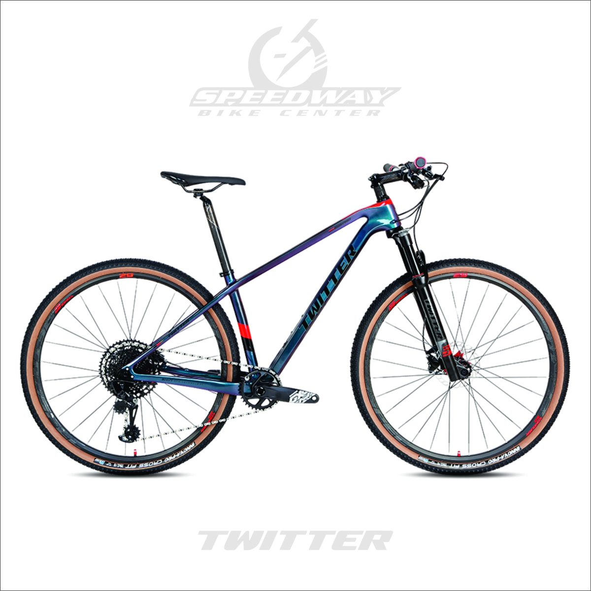 Los cuadros Twitter se fabrican con fibra de carbono del más alto nivel.. El material compuesto T800 / T900 con la más alta calidad es moldeado por tecnología EPS, cortando y clasificando con precisión la fibra de carbono de forma manual y luego ensamblando todo junto llegando a mas de 60 procedimientos. CARACTERÍSTICAS: Cuadro: Warrior PRO – Carbono T900 – Boost (142/148) Manubrio: Twitter de aluminio Manubrio 31.8×720 - Stem 90mm – Poste asiento 31.6×350mm Clamp: Alu alloy,Quick release 34.9mm Horquilla: Twitter RS6, horquilla de aire con bloqueo remoto, Thru-axle 15*110mm Boost Grupo: SRAM SX EAGLE-12S Descarrilador delantero: N/A Descarrilador tresero: SRAM SX EAGLE 12v Palancas: SRAM SX EAGLE DUB,34T Piñones: SRAM PG1210 EAGLE-12S, 11-50T Cadena: YBN-12S Caja pedalera: Hollow BB92×41×29, pressed Frenos: SHIMANO MT200 hydr+PRO float disc 160/160 Ruedas: Retrospec doble pared aluminio Cubiertas: CHAOYANG Asiento: Twitter cómodo y ligero Pedales: Retrospec de aluminio Precio contado efectivo, depósito o transferencia únicamente.